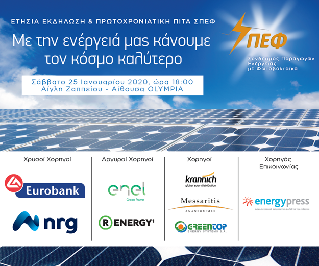 Το Σάββατο 25 Ιανουαρίου 2020 στην Αθήνα και ώρα 18:00 μμ θα πραγματοποιηθεί η Ετήσια Εκδήλωση και Κοπή της Πρωτοχρονιάτικης Πίτας του ΣΠΕΦ, στην Αίγλη Ζαππείου, Αίθουσα Olympia. Προσωπικότητες φορέων της Πολιτείας από το χώρο της ενέργειας έχουν προσκληθεί και επιβεβαιώσει την παρουσία τους. Την εκδήλωση υποστηρίζει ως χορηγός η εταιρία Messaritis Ανανεώσιμες.